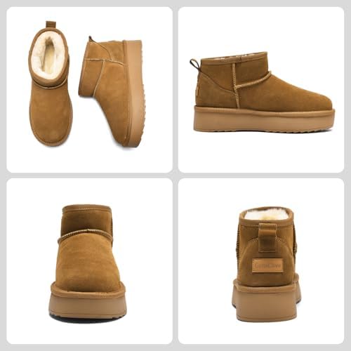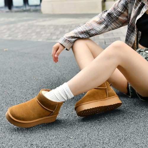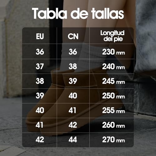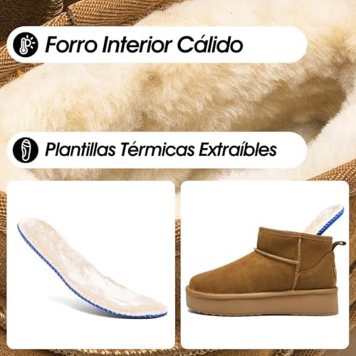 Destacan por su forro de pelo sintético que ofrece calidez excepcional hasta en condiciones extremas de hielo. Su suela TPR antideslizante con textura especializada garantiza agarre óptimo en superficies resbaladizas como nieve y hielo. El tacón de plataforma de 4 cm alarga visualmente la silueta manteniendo máxima comodidad al caminar. La parte superior de piel de ante sintética de primera calidad combina estilo moderno con durabilidad excepcional. Incluye plantilla extraíble de espuma